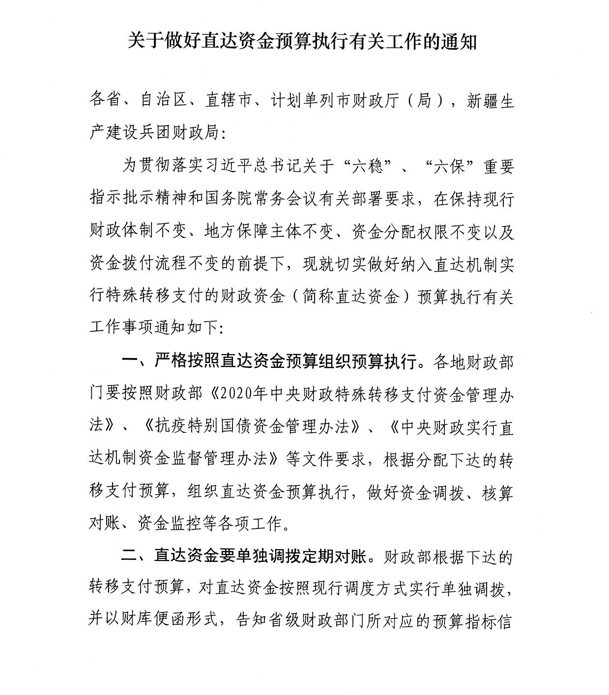财政部关于做好直达资金预算执行有关工作的通知