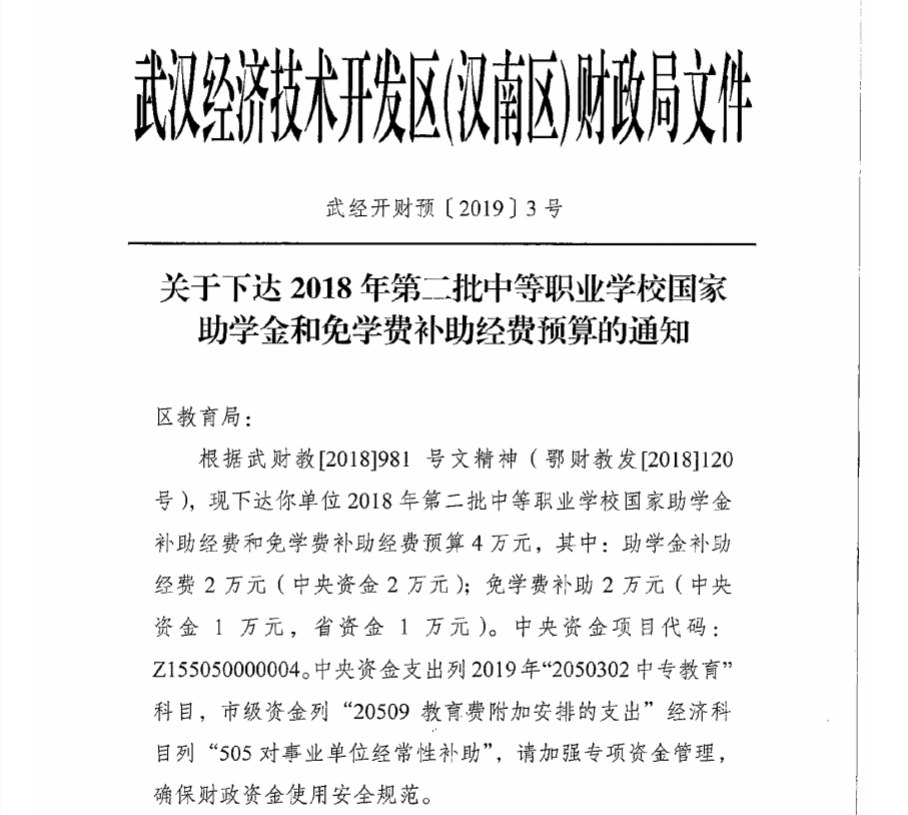 关于下达区教育局2018年第二批中等职业学校国家助学金和免学费补助