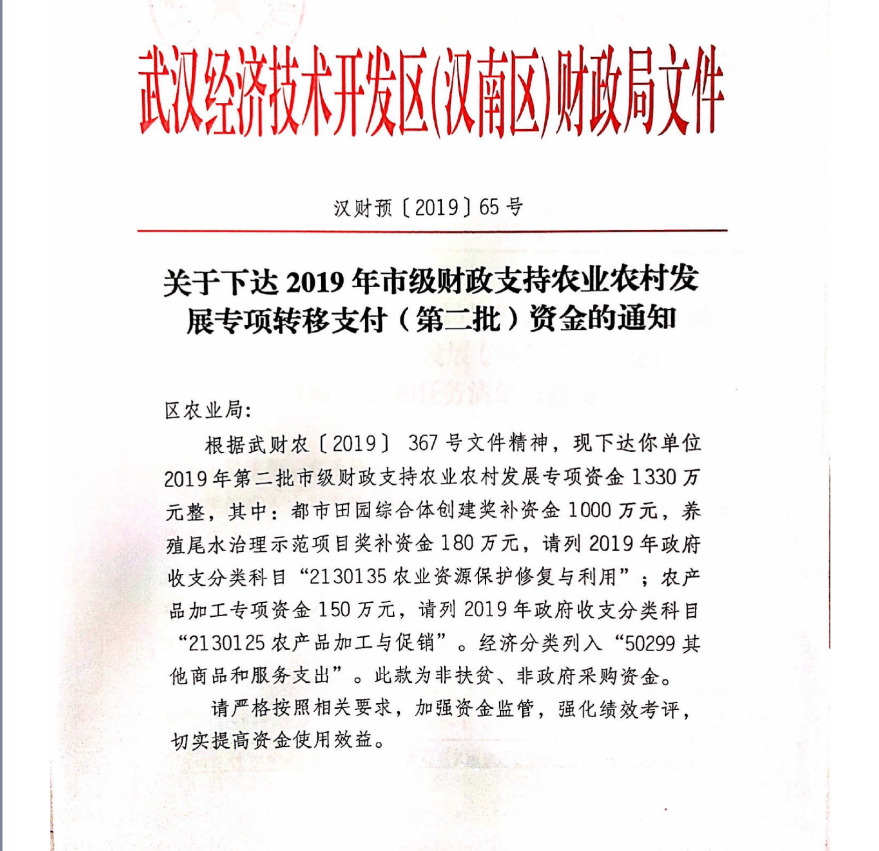 汉财预[2019]65号关于下达2019年市级财政支持农业农村发展专项转移支付资金(第二批)的通知