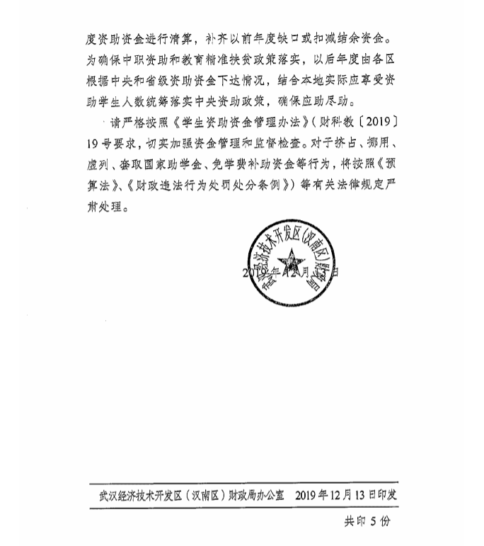 关于下达区教育局2019年中等职业学校国家助学金和免学费补助经费