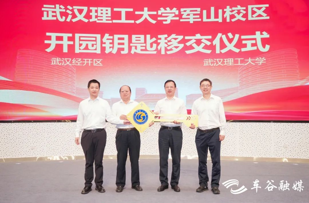 当天,武汉经开区与武汉理工大学签署武汉理工大学军山校区共建协议,刘子清、唐超向信思金、杨宗凯移交武汉理工大学军山校区开园钥匙。
