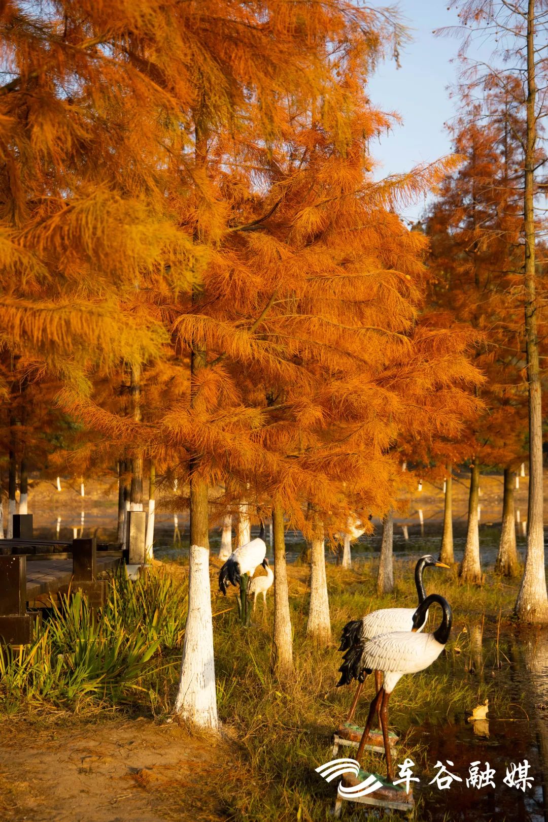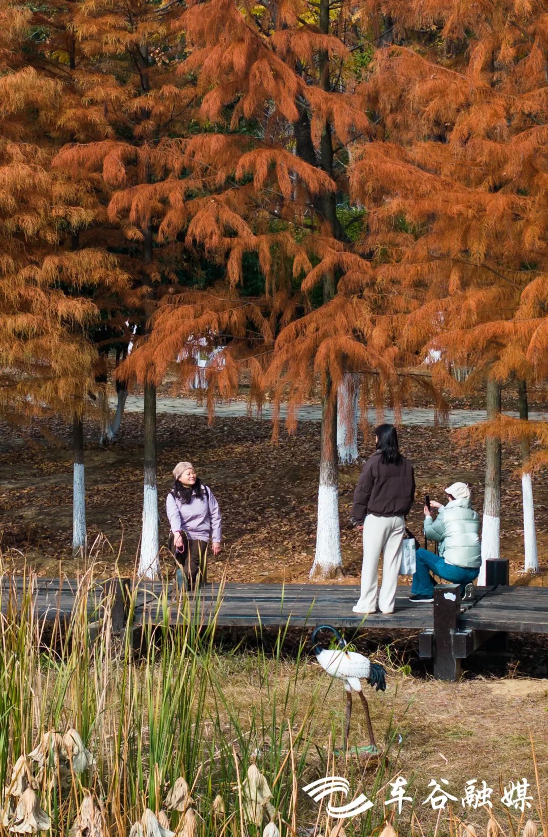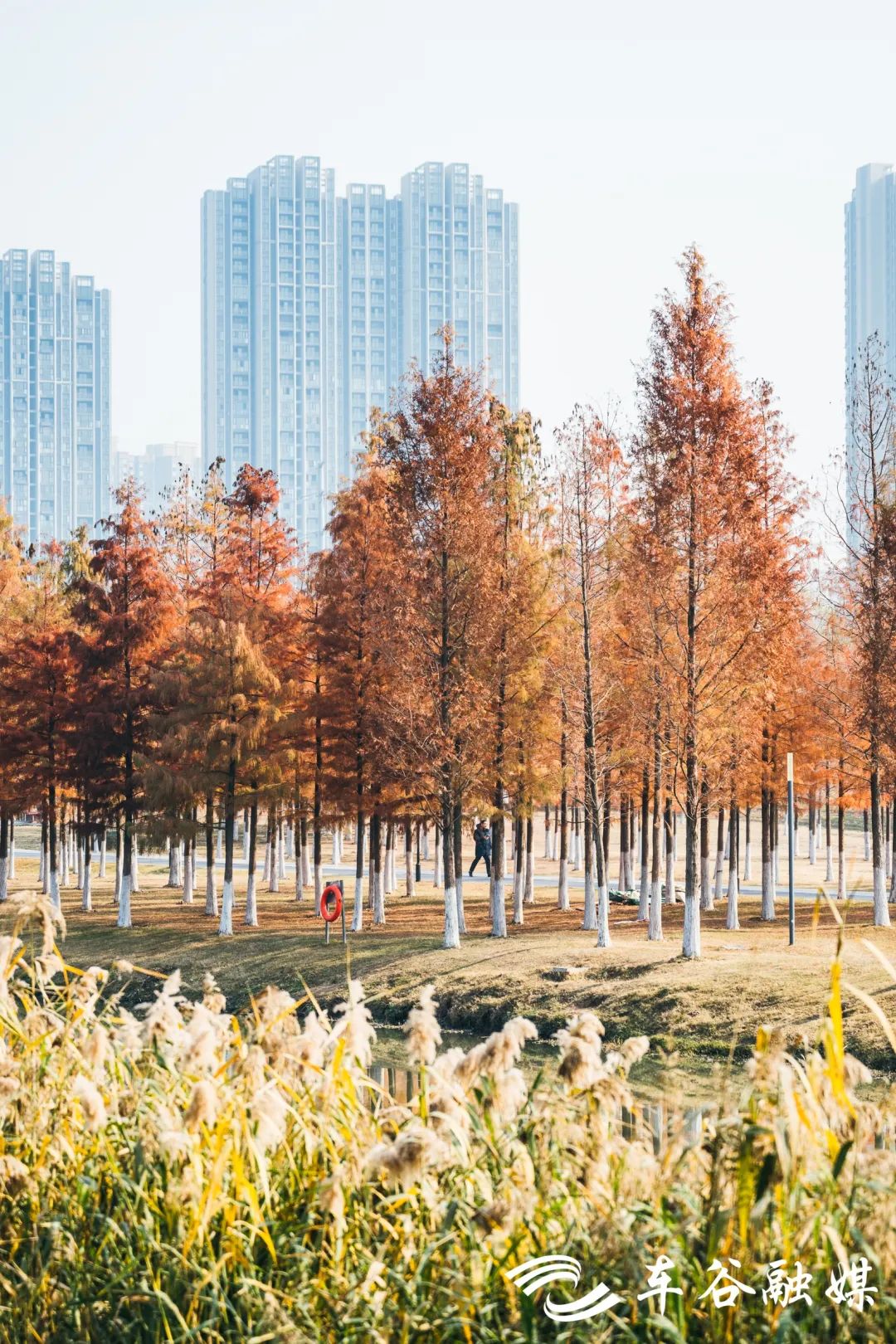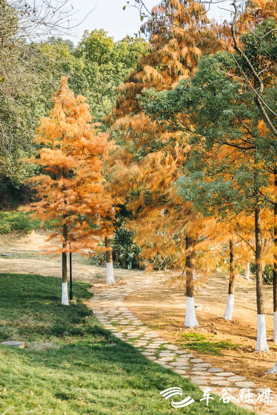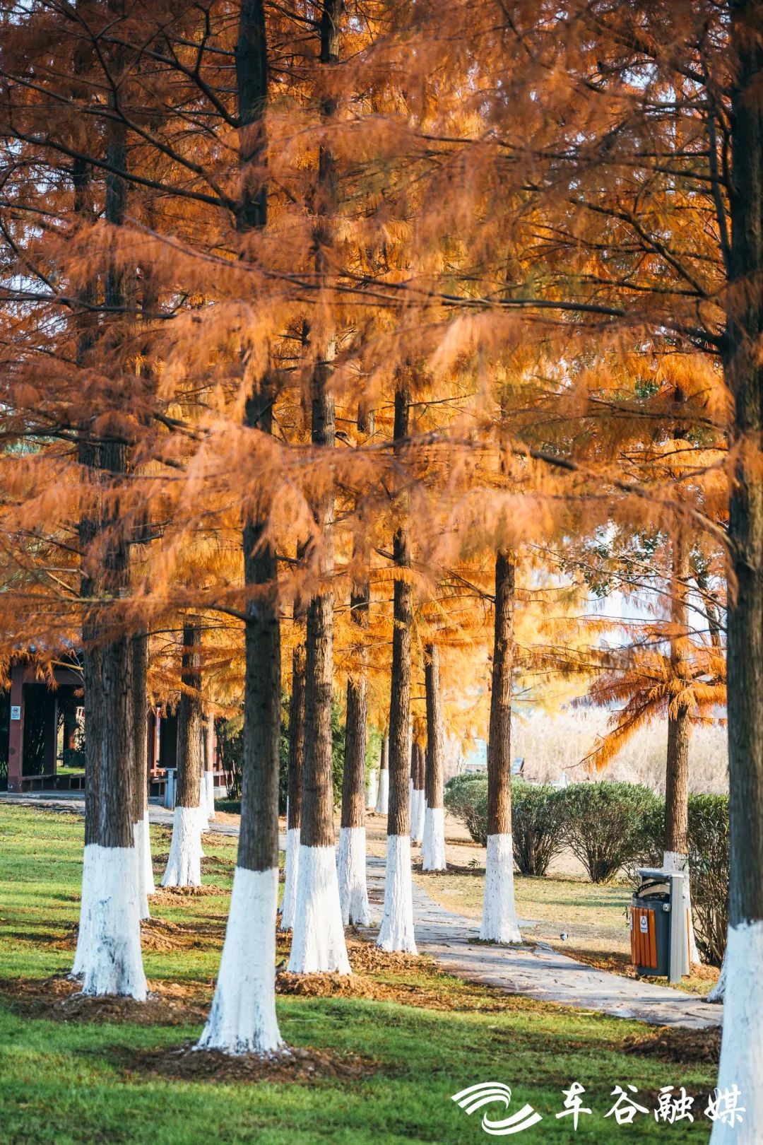 「三角湖公园」内,杉树橙黄,梧桐深红,美拉德色系的秋冬氛围感立刻拉满。