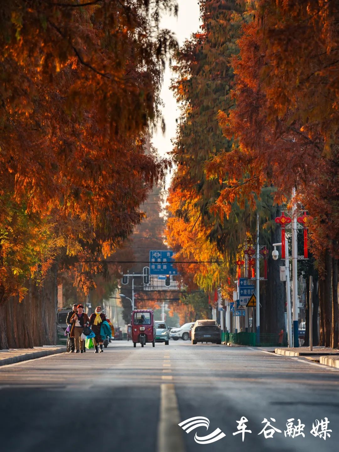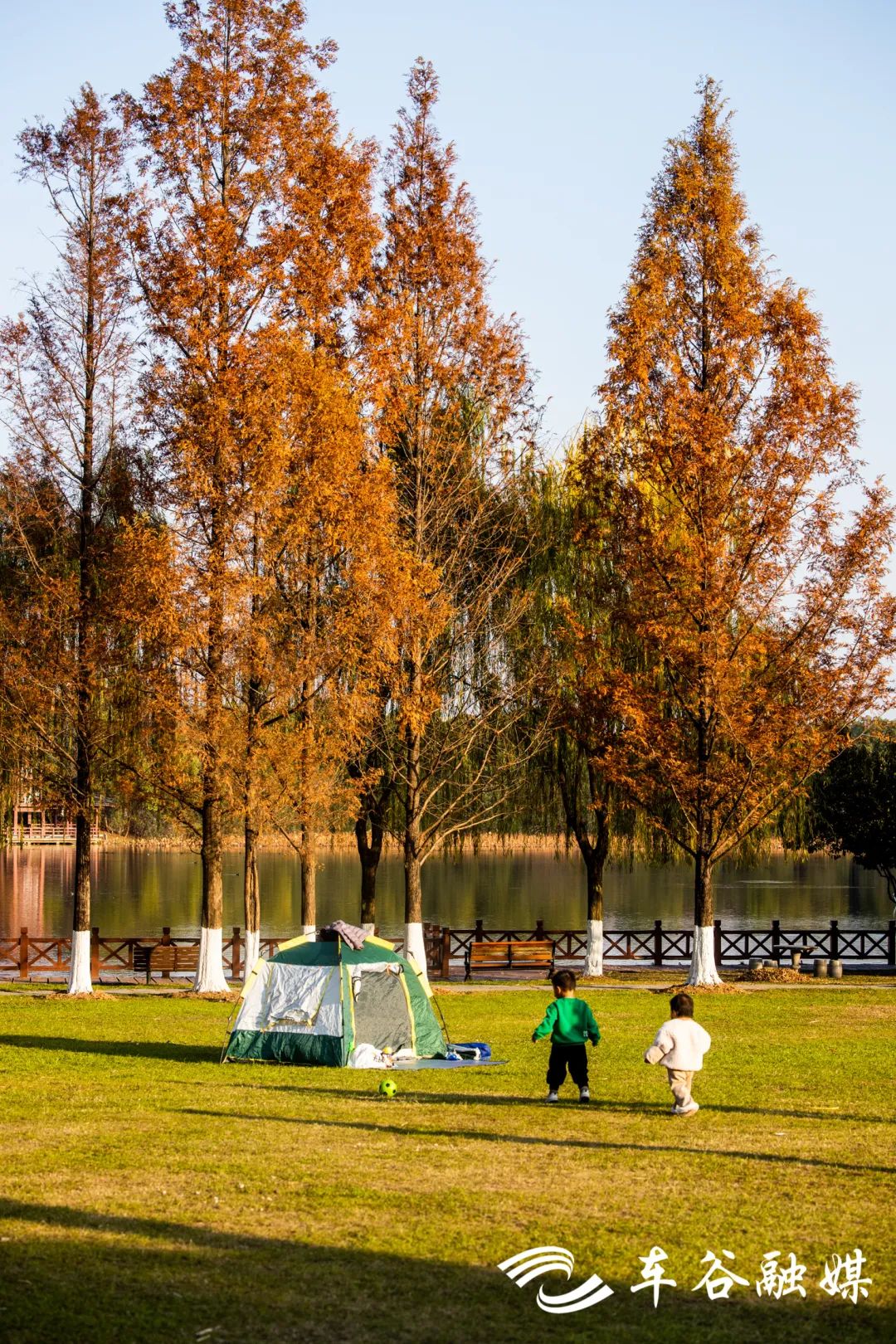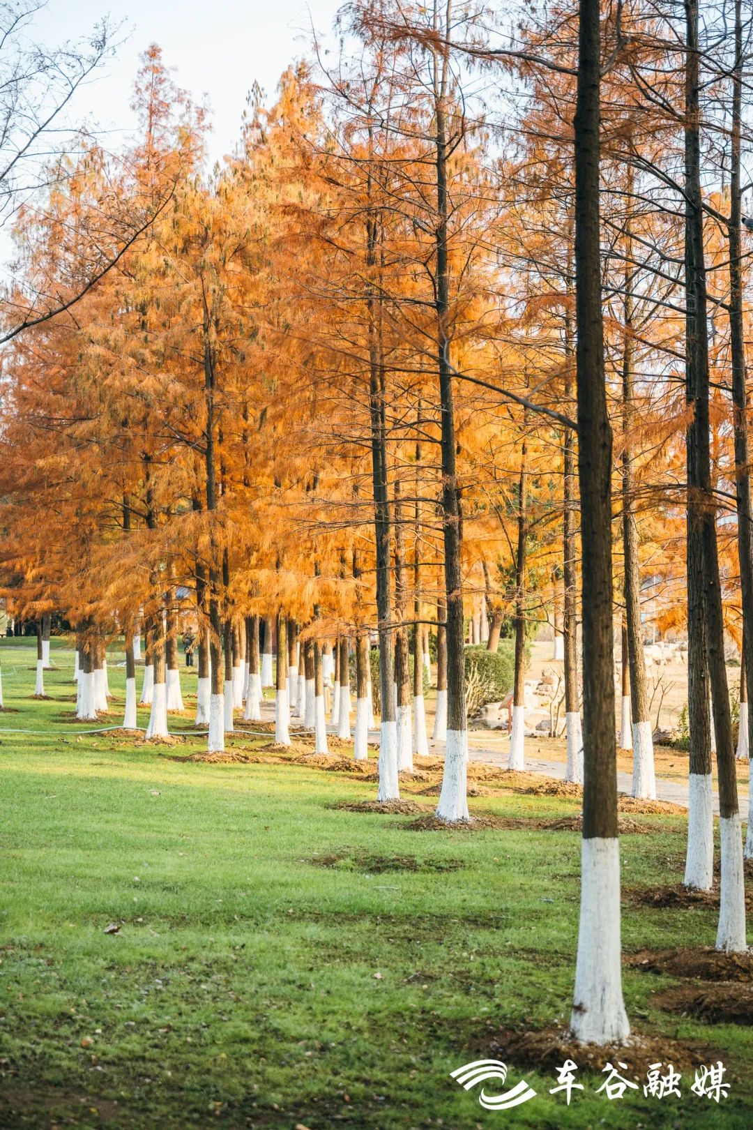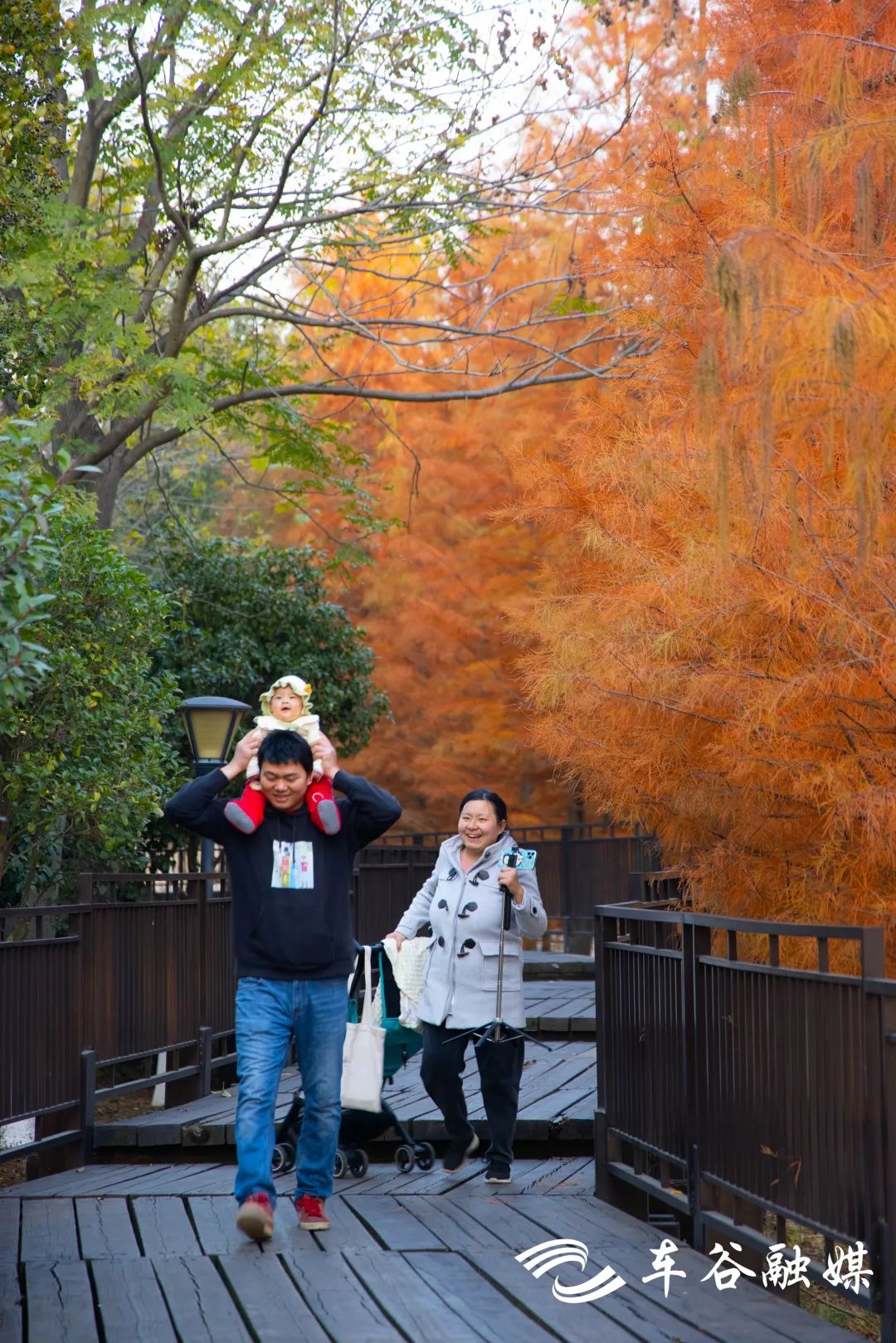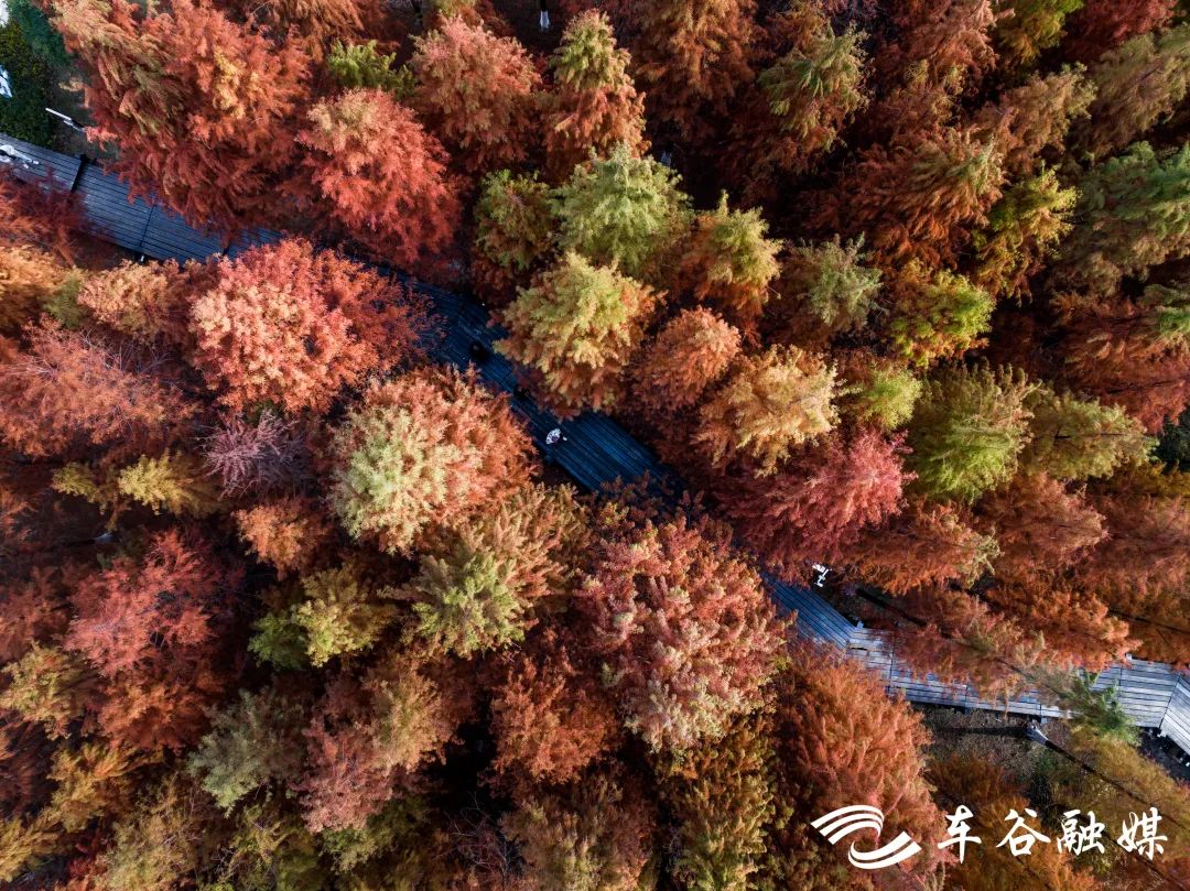 「三角湖公园」内,杉树橙黄,梧桐深红,美拉德色系的秋冬氛围感立刻拉满。