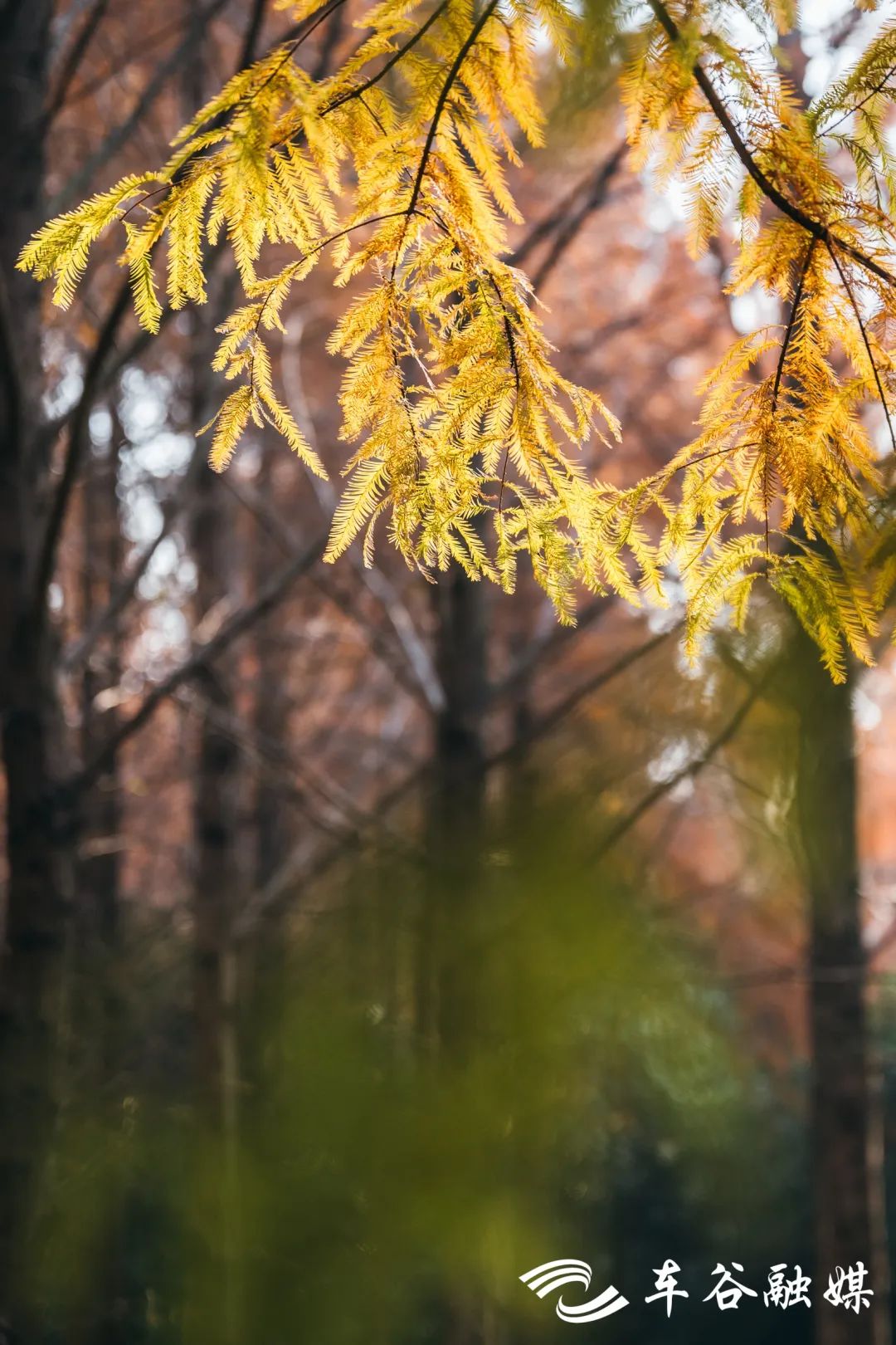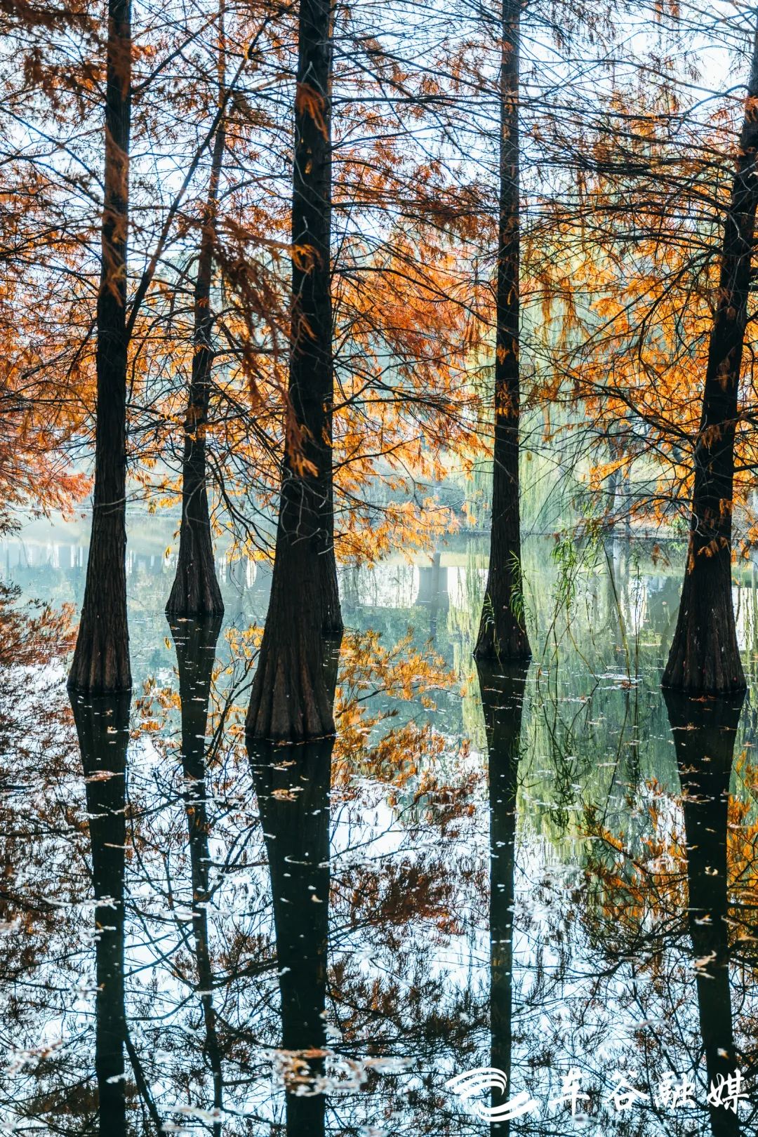 橙黄橘绿的落羽杉在湖中抱团出道,组建成一片“油画森林”。树叶层层叠叠,在暖阳地轻抚下透露出点点鎏金。